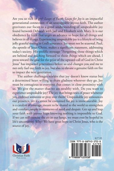 Are you so rich in joy? Leaps of Faith, Leaps for Joy is an impactful generational connection of an unstoppable joyous faith. The author gravitates our focus to a good understanding of unspeakable joy found between Deborah with Jael and Elizabeth with Mary. It is our obedience by faith that urges an advance to hope for all things and believes in all things. Experiencing unspeakable joy is a lifestyle of being jolly grateful resting in God's assurance. Joy must not be seasonal. Paul, the apostle of Jesus Christ, makes a significant statement, addressing today's society. His prolific message "Forgetting those things which are behind and reaching forward to those things which are ahead, I press toward the goal for the prize of the upward call of God in Christ Jesus" has impacted generations before us and changes you and me to not only fuel our faith in joy, but also to elevate a genuine faith on fire to impact the next generation. The author challenges readers that joy doesn't know status but a determined heart willing to share gladness wherever they go. Joy must be contagious to everyone that comes in close proximity with us. We give the matter that we are wealthy with. Do you want to experience unspeakable joy? The joy that brings tears of peace whenever you embrace someone or pray over them? Unspeakable joy announces our presence, yet it cannot be contained for joy is immeasurable. Joy is a catalyst of courage, meant to be shared to the world to strengthen and comfort people in moments of need and despair. Get up and leap your faith with joyous leaps knowing nothing is impossible to God. If we can still exercise the air in our lungs, we must ever be hopeful in life's uncertainty. Why? We have great hope in Christ Jesus, who is the source of joy.
