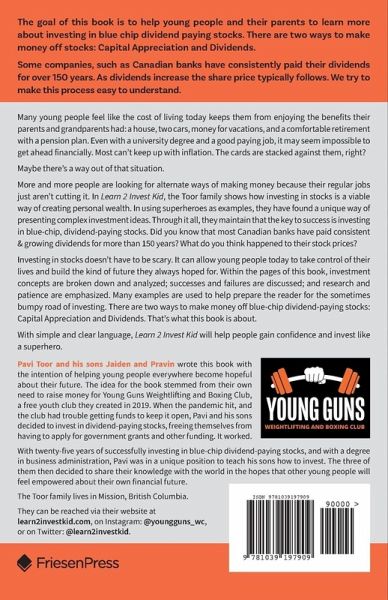 Pavi Toor and his sons Jaiden and Pravin wrote this book with the intention of helping young people everywhere become hopeful about their future. The idea for the book stemmed from their own need to raise money for Young Guns Weightlifting and Boxing Club, a free youth club they created in 2019. When the pandemic hit, and the club had trouble getting funds to keep it open, Pavi and his sons decided to invest in dividend-paying stocks, freeing themselves from having to apply for government grants and other funding. It worked. With twenty-five years of successfully investing in blue-chip dividend-paying stocks, and with a degree in business administration, Pavi was in a unique position to teach his sons how to invest. The three of them then decided to share their knowledge with the world in the hopes that other young people will feel empowered about their own financial future. The Toor family lives in Mission, British Columbia. They can be reached via their website at learn2investkid.com, on Instagram: @youngguns_wc, or on Twitter: @learn2investkid.