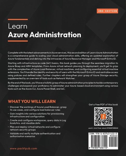 Build cloud infrastructure expertise by elevating your Azure admin skills, mastering core services, and boosting productivity with helpful tools Key Features:Learn about infrastructure as code, deploy resources with ARM templates, and migrate to Azure Bicep Deploy Azure Policy and explore ideas for implementing policies based on real-world scenarios Understand the structure and hierarchy of Azure resources and Azure subscriptions and the authorization and authentication mechanism Book Description: Complete with the latest advancements in Azure services, this second edition of Learn Azure Administration is a comprehensive guide to scaling your cloud administration skills, offering an updated exploration of Azure fundamentals and delving into the intricacies of Azure Resource Manager and Azure Active Directory. Starting with infrastructure as code (IaC) basics, this book guides you through the seamless migration to Azure Bicep and ARM templates. From Azure virtual networks planning to deployment, you'll get to grips with the complexities of Azure Load Balancer, virtual machines, and configuring essential virtual machine extensions. You'll handle the identity and security for users with the Microsoft Entra ID and centralize access using policies and defined roles. Further chapters strengthen your grasp of Azure Storage security, supplemented by an overview of tools such as Network Watcher. By the end of the book, you'll have a holistic grasp of Azure administration principles to tackle contemporary challenges and expand your proficiency to administer your Azure-based cloud environment using various tools like Azure CLI, Azure PowerShell, and infrastructure as code. What You Will Learn:Discover the workings of Azure Load Balancer, grasp its use cases, and configure load balancer rules Gain insights into various solutions for provisioning infrastructure and configuration Create and configure workspaces, query data in Log Analytics, and visualize data Plan and deploy virtual networks and configure network security groups Validate and verify multiple authentication and authorization scenarios Who this book is for: This book is for cloud administrators, system administrators, and IT professionals who want to expand their skill set to enter the world of cloud computing. For IT professionals and engineers who are already familiar with the basics of Azure services, this book will serve as a step-by-step guide to solving the most common Azure problems. A basic understanding of cloud concepts such as IaaS, PaaS, virtualization, networking, and common Azure services is required.