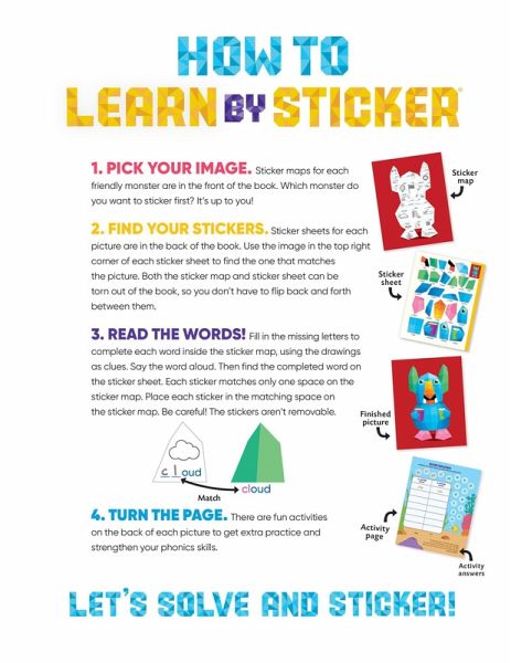 Explore a fun new way to practice phonics: with stickers! This activity-packed sticker book for children ages 5 and up provides basic phonics practice while creating ten friendly monster images, one sticker at a time. Step 1: Fill in the missing letters Step 2: Find the matching sticker Step 3: Place the sticker …and watch your friendly monster pictures come to life! Combining the joy of Paint by Sticker Kids® with the curriculum-based practice of Brain Quest®, Learn by Sticker® is a completely new way for kids to practice key learning skills. In Learn by Sticker: Beginning Phonics, apply first grade-level phonics concepts (including long vowels, short vowels, initial consonants, and more) to complete words and determine where to place each sticker to create ten sticker images of adorable friendly monsters. Plus, the back of each sticker page contains fun, phonics-related activities like decoding secret messages, finding mystery words, and more.