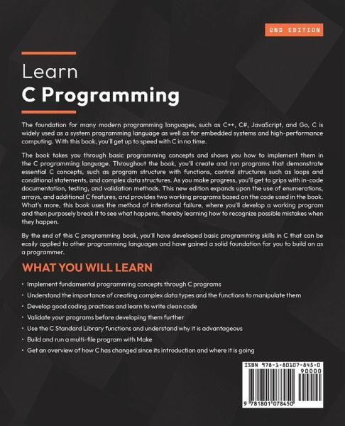 Get started with writing simple programs in C while learning core programming conceptsKey Features: - Learn essential C concepts such as variables, data structures, functions, loops, and pointers - Grasp the core programming aspects that form the base of many modern programming languages - Work with updated code samples and cover array declaration and initialization in detail in this new editionBook Description: The foundation for many modern programming languages such as C++, C#, JavaScript, and Go, C is widely used as a system programming language as well as for embedded systems and high-performance computing. With this book, you'll be able to get up to speed with C in no time. The book takes you through basic programming concepts and shows you how to implement them in the C programming language. Throughout the book, you'll create and run programs that demonstrate essential C concepts, such as program structure with functions, control structures such as loops and conditional statements, and complex data structures. As you make progress, you'll get to grips with in-code documentation, testing, and validation methods. This new edition expands upon the use of enumerations, arrays, and additional C features, and provides two working programs based on the code used in the book. What's more, this book uses the method of intentional failure, where you'll develop a working program and then purposely break it to see what happens, thereby learning how to recognize possible mistakes when they happen. By the end of this C programming book, you'll have developed basic programming skills in C that can be easily applied to other programming languages and have gained a solid foundation for you to build on as a programmer.What You Will Learn: - Implement fundamental programming concepts through C programs - Understand the importance of creating complex data types and the functions to manipulate them - Develop good coding practices and learn to write clean code - Validate your programs before developing them further - Use the C Standard Library functions and understand why it is advantageous - Build and run a multi-file program with Make - Get an overview of how C has changed since its introduction and where it is goingWho this book is for: If you're an absolute beginner who has basic familiarity with operating a computer, this book will help you learn the most fundamental concepts and practices that you need to know to become a successful C programmer. If you're an experienced programmer, you'll find the full range of C syntax as well as common C idioms covered in the book useful. Table of Contents Running Hello, world Understanding Program Structure Working with Basic Data Types Using Variables and Assignments Exploring Operators and Expressions Exploring Conditional Program Flow Exploring Loops and Iterations Creating and Using Enumerations Creating and Using Structures Creating Custom Data Types with Typedef Working with Arrays Working with Multi-dimensional Arrays Using Pointers Understanding Arrays and Pointers Working with Strings Creating and Using More Complex Structures Understanding Memory Allocation and Lifetime Using Dynamic Memory Allocation Exploring Formatted Output Getting Input From the Command Line Exploring Formatted Input Working with Files Using File Input and File Output Working with Multi-File Programs Understanding Scope Building Multi-File Programs with Make Creating Two Card Programs Appendix