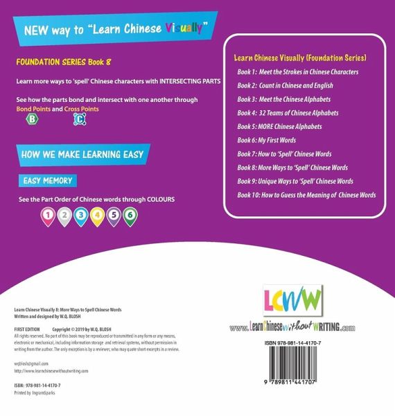 New Way to Learn Chinese VISUALLY! Created for toddlers, students learning Chinese as a second or foreign language. Also suitable for adults young at heart! Explained in English so parents who do not speak Mandarin can also guide their children. The eighth book in the Foundation Series, developed to help learners develop visual skills to decode Chinese characters without writing Learn how to 'spell' Chinese characters easily by seeing where the PARTS (alphabets and strokes) INTERSECT See the parts of Chinese words through COLOURS. Note that Chinese characters are usually learnt as a whole and this can take up a lot of memory. As a result, the more one learns the more confused one gets. This new way to learn Chinese visually helps learners to decode Chinese characters into their components and learn how to form/spell characters through simple rules. To 'spell' is to write or name the parts (alphabets or strokes) that form a word in the correct sequence. Learn how to form Chinese characters easily using simple rules, bond points and cross points Apply content learned in Book 1 (Strokes), Books 4 and 5 (Alphabets) in Books 7, 8 and 9 (Spelling Chinese Words) LEARN CHINESE VISUALLY (FOUNDATION SERIES) BOOK 1: MEET THE STROKES IN CHINESE CHARACTERS BOOK 2: COUNT IN CHINESE AND ENGLISH BOOK 3: MEET THE CHINESE ALPHABETS BOOK 4: 32 TEAMS OF CHINESE ALPHABETS BOOK 5: MORE CHINESE ALPHABETS BOOK 6: MY FIRST WORDS BOOK 7: HOW TO 'SPELL' CHINESE WORDS BOOK 8: MORE WAYS TO 'SPELL' CHINESE WORDS BOOK 9: UNIQUE WAYS TO 'SPELL' CHINESE WORDS BOOK 10: HOW TO GUESS THE MEANING OF CHINESE WORDS