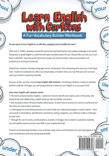 Do you want to learn English in an effective, engaging and incredibly fun way? With over 1.3 billion speakers around the world and representing the most spoken language in the world, being able to speak English is a tool that will open countless doors for you. But just like any tool, you must keep it polished - learning correct grammar, proper use of punctuation, clear pronunciation and proficiency in writing are essential. Sometimes, however, learning a language can be complicated, time-consuming and cause you to hit dead ends. Traditional textbooks are often too complicated, and other times you may find you can't connect with your teacher's teaching methods. Because of this, we have created Learn English with Cartoons. Containing a fantastic variety of methods built for students of all ages, you will be guaranteed to improve your English in a very quick time! How Learn English with Cartoons works: · The book contains twenty chapters - easily learn how to identify and express parts of the body, talk about family and relationships, explain what you like and dislike, and more! · Key vocabulary starts off each chapter, allowing you to learn how to pronounce common words and see how they are used in basic sentences. · Challenging but entertaining exercises are used to help you make great progress in each chapter - from crosswords to illustrations, identification exercises to sorting categories, you will have endless challenges to work with. · Through the use of comics and illustrations, students of all ages, from children to adult ESL students, you will rapidly acquire precious new skills in your English learning! Embark on this learning adventure now and start using comics and illustrations for learning English in the most revolutionary and entertaining way possible. Look no further! Pick up your copy of Learn English with Cartoons now!