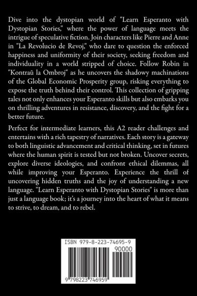 Learn Esperanto with Dystopian Stories: A Journey through Despair and Hope Dive into the shadowy depths of dystopian worlds with "Learn Esperanto with Dystopian Stories," an enthralling Esperanto A2 Reader designed to elevate your language skills while immersing you in the hauntingly beautiful realm of speculative fiction. This collection is meticulously crafted to cater to Esperanto learners, offering a unique blend of language education and captivating storytelling. Inside, you'll discover tales of rebellion, mystery, and the indomitable human spirit: La Revolucio de Revoj (The Revolution of Dreams): Experience a future France under a draconian regime of forced happiness and uniformity, where Pierre, a young man harboring forbidden dreams, dares to question the status quo, igniting a quiet yet profound rebellion. Konträ la Ombroj (Against the Shadows): Follow Robin, an audacious journalist, as he unravels the sinister secrets of the Global Economic Prosperity organization, challenging the very fabric of society in his quest for truth. Ombroj de la Kredo (Shadows of Belief), La Tero Sub la ¿talo (The Earth Beneath the Steel), and more: Delve into stories that explore the complexities of belief, technology, silence, wisdom, and past glories, each narrative offering new vocabulary and language structures, interwoven with thought-provoking themes. Embark on a Linguistic Journey: Designed for those at the A2 Esperanto proficiency level, this reader not only enhances your vocabulary and grammatical understanding but also challenges your perceptions and invites deep reflection. With comprehensive glossaries and engaging narratives, your Esperanto skills will flourish as you navigate through these dystopian landscapes. Why Choose This Reader? Immersive Learning: Engage with the Esperanto language in a context that's both meaningful and exciting. Cultural Enrichment: Gain insights into diverse ideological and philosophical discussions through the lens of Esperanto culture. Critical Thinking: Encourage reflective thought and discussion, extending learning beyond mere language acquisition. Whether you're a language learner seeking to expand your Esperanto abilities or a literary enthusiast intrigued by dystopian themes, "Learn Esperanto with Dystopian Stories" offers a unique and enriching experience. Prepare to be transported into worlds where the struggle for identity, freedom, and truth unfolds in the language of international harmony. Embark on this linguistic and literary journey, and let the stories of hope, resistance, and discovery unfold with each page. Welcome to a world where learning meets imagination-welcome to "Learn Esperanto with Dystopian Stories."