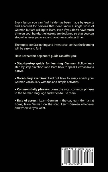 Discover the Best and Fastest Way to Learn German With This Guide Designed Specifically for Beginners. Would you like to:Learn how to speak German fluently? Learn proper and accurate German pronunciation? Master the German vocabulary and daily used phrases? But you:Don't have much time on your hands? Think that learning German is tedious and boring? You don't have to worry, because this beginner's guide for learning German has everything you need to get started. Especially if you have never learned German before. Every lesson you can find inside has been made by experts and adapted for persons that don't know a single word of German but are willing to learn. Even if you don't have much time on your hands, the lessons are designed so that you can stop whenever you want and continue at a later time. The topics are fascinating and interactive so that the learning will be easy and fun! Here is what this beginner's guide can offer you:Step-by-step guide for learning German: Follow easy step-by-step directions and learn how to speak German like a native. Vocabulary exercises: Find out how to easily enrich your German vocabulary with fun and simple activities. Common daily phrases: Learn the most common phrases in the German language and when to use them. Ease of access: Learn German in the car, learn German at home, learn German on the road. Learn German whenever and wherever you want. If you are looking for a fast and easy way to learn German, this guide is perfect for you. With these step-by-step guides and exercises, you'll speak German like a native in no time. So what are you waiting for? Scroll up, click on "Buy Now" and Get Your Copy Now!