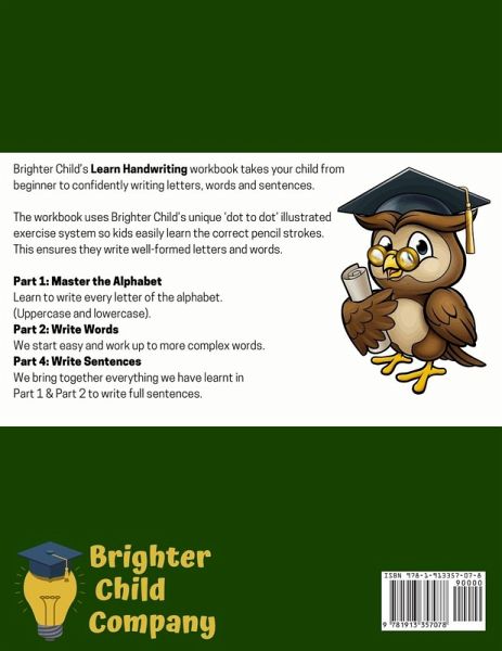 Unique 'dot to dot' method makes learning handwriting easy and fun THE IDEAL STARTING WORKBOOK FOR BEGINNERS - OVER 100 PAGES This handwriting workbook is very different to all other guides out there. It uses Brighter Child's unique 'dot to dot' illustrated exercise system to teach your child exactly how to form each letter correctly - both lowercase and uppercase. This sets it apart and makes it simply the best way to learn handwriting. Part 1: Master the Alphabet Learn to write every letter of the alphabet. The child then traces and copies each letter multiple times to ensure that each one is mastered. Part 2: Write Words We start easy and work up to more complex words. Part 3: Write Sentences We bring together everything we have learnt in Part 1 & Part 2 to write full sentences. Your child will master handwriting in the most enjoyable and comprehensive way possible. This is the only book you need! 8.5" x 11" - Large size pages Learn to write the alphabet easily Unique 'dot-to-dot' system makes learning fun Perfect for grades 2-5 Over 100 pages