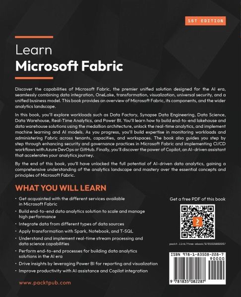 Harness the power of Microsoft Fabric to develop data analytics solutions for various use cases guided by step-by-step instructionsKey FeaturesExplore Microsoft Fabric and its features through real-world examples Build data analytics solutions for lakehouses, data warehouses, real-time analytics, and data science Monitor, manage, and administer your Fabric platform and analytics system to ensure flexibility, performance, security, and control Purchase of the print or Kindle book includes a free PDF eBook Book Description Discover the capabilities of Microsoft Fabric, the premier unified solution designed for the AI era, seamlessly combining data integration, OneLake, transformation, visualization, universal security, and a unified business model. This book provides an overview of Microsoft Fabric, its components, and the wider analytics landscape. In this book, you'll explore workloads such as Data Factory, Synapse Data Engineering, data science, data warehouse, real-time analytics, and Power BI. You'll learn how to build end-to-end lakehouse and data warehouse solutions using the medallion architecture, unlock the real-time analytics, and implement machine learning and AI models. As you progress, you'll build expertise in monitoring workloads and administering Fabric across tenants, capacities, and workspaces. The book also guides you step by step through enhancing security and governance practices in Microsoft Fabric and implementing CI/CD workflows with Azure DevOps or GitHub. Finally, you'll discover the power of Copilot, an AI-driven assistant that accelerates your analytics journey. By the end of this book, you'll have unlocked the full potential of AI-driven data analytics, gaining a comprehensive understanding of the analytics landscape and mastery over the essential concepts and principles of Microsoft Fabric.What you will learnGet acquainted with the different services available in Microsoft Fabric Build end-to-end data analytics solution to scale and manage high performance Integrate data from different types of data sources Apply transformation with Spark, Notebook, and T-SQL Understand and implement real-time stream processing and data science capabilities Perform end-to-end processes for building data analytics solutions in the AI era Drive insights by leveraging Power BI for reporting and visualization Improve productivity with AI assistance and Copilot integration Who this book is for This book is for data professionals, including data analysts, data engineers, data scientists, data warehouse developers, ETL developers, business analysts, AI/ML professionals, software developers, and Chief Data Officers who want to build a future-ready data analytics solution for long-term success in the AI era. For PySpark and SQL students entering the data analytics field, this book offers a broad foundation for developing the skills to build end-to-end analytics systems for various use cases. Basic knowledge of SQL and Spark is assumed.Table of ContentsOverview of Microsoft Fabric and Understanding Its Different Concepts Understanding Different Workloads and Getting Started with Microsoft Fabric Building an End-to-End Analytics System - Lakehouse Building an End-to-End Analytics System - Data Warehouse Building an End-to-End Analytics System - Real-Time Analytics Building an End-to-End Analytics System - Data Science Monitoring Overview and Monitoring Different Workloads Administering Fabric Security and Governance Overview (N.B. Please use the Look Inside option to see further chapters)