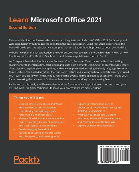 Take your Microsoft Office skills to the next level by mastering the exciting new features and enhancements in Microsoft Office 2021, including communicating, collaborating, and presenting using Teams Key Features:Get a progressive walkthrough of the new desktop and web apps with real-world examples Enrich your skillset by learning new productivity feature enhancements for Office web and desktop Discover how to use Microsoft Teams to communicate, collaborate, and present during meetings Book Description: This second edition book covers the new and exciting features of Microsoft Office 2021 for desktop and web apps, helping you broaden the skills from the previous edition. Using real-world experiences, this book will guide you through practical examples that set off your thought process to boost productivity. To build new skills in each application, the book ensures that you gain a thorough understanding of new functions, such as PivotTables, Dashboards, and data manipulation methods in Excel. You'll explore PowerPoint tools such as Presenter Coach, Presenter View, the record tool, and setting reading order to mention a few. You'll also manipulate slide elements using Auto Fix, draw features, insert video captions, explore playback options, and rehearse presentations using the body language Presenter Coach feature. The book demystifies the Transform feature and shows you how to dictate directly in Word. You'll even be able to work with Styles by refining the layout and multiple tables of contents. Finally, you'll focus on making the best use of Outlook enhancements and working remotely using Teams. By the end of this book, you'll have understood the features of each app inside out and enhanced your existing skills using new techniques to make your professional life more efficient. What You Will Learn:Uncover OneDrive features and Word enhancements such as dictation, co-authoring, embedding, styles, referencing, and media tools Manage Word document layouts, online forms, recording document automation, and track, compare, and combine Create engaging PowerPoint presentations using Presenter Coach, Auto Fix, Record, and drawing tools Explore Excel functions such as XLOOKUP, LET, XMATCH IFS, arrays and IFERROR, and VLOOKUP Work with database and COUNTIF functions, Advanced Filter, clean data, and PivotTables and Dashboards Explore Outlook enhancements Who this book is for: If you work with Microsoft Office applications but are yet to discover the complete range of features, this second edition is tailored to broaden your skillset with new features and functionalities. It would be of value for those working in any industry and for students moving into the workplace or preparing for Microsoft Office certification. The book uses real-world practical workplace examples to help you get ready to apply your skills and make the most of the recent features of Microsoft Office. Although not a prerequisite, a solid understanding of the Microsoft Office applications will be beneficial.