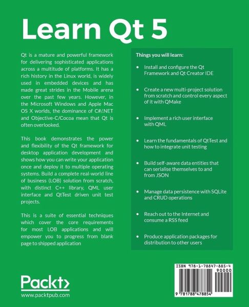 Learn the fundamentals of QT 5 framework to develop interactive cross-platform applications Key Features A practical guide on the fundamentals of application development with QT 5 Learn to write scalable, robust and adaptable C++ code with QT Deploy your application on different platforms such as Windows, Mac OS, and Linux Book Description Qt is a mature and powerful framework for delivering sophisticated applications across a multitude of platforms. It has a rich history in the Linux world, is widely used in embedded devices, and has made great strides in the Mobile arena over the past few years. However, in the Microsoft Windows and Apple Mac OS X worlds, the dominance of C#/.NET and Objective-C/Cocoa means that Qt is often overlooked. This book demonstrates the power and flexibility of the Qt framework for desktop application development and shows how you can write your application once and deploy it to multiple operating systems. Build a complete real-world line of business (LOB) solution from scratch, with distinct C++ library, QML user interface, and QtTest-driven unit-test projects. This is a suite of essential techniques that cover the core requirements for most LOB applications and will empower you to progress from a blank page to shipped application. What you will learn Install and configure the Qt Framework and Qt Creator IDE Create a new multi-project solution from scratch and control every aspect of it with QMake Implement a rich user interface with QML Learn the fundamentals of QtTest and how to integrate unit testing Build self-aware data entities that can serialize themselves to and from JSON Manage data persistence with SQLite and CRUD operations Reach out to the internet and consume an RSS feed Produce application packages for distribution to other users