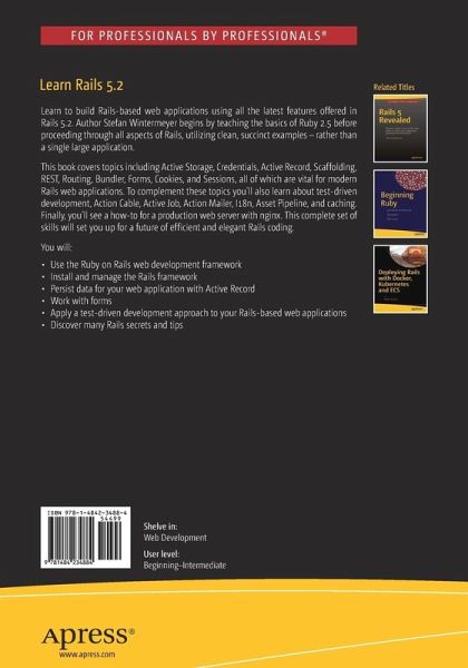 Learn to build Rails-based web applications using all the latest features offered in Rails 5.2. Author Stefan Wintermeyer begins by teaching the basics of Ruby 2.5 before proceeding through all aspects of Rails, utilizing clean, succinct examples - rather than a single large application.