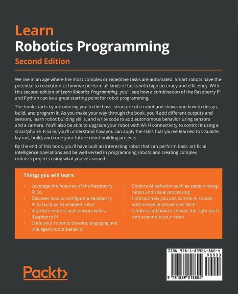 This second edition of Learn Robotics Programming covers the basics of robotics and guides you in implementing artificial intelligence in robots. You'll learn to add different sensors and use their output to control your robot, along with learning how to construct robots using a combination of Python, Raspberry Pi, and camera sensors.