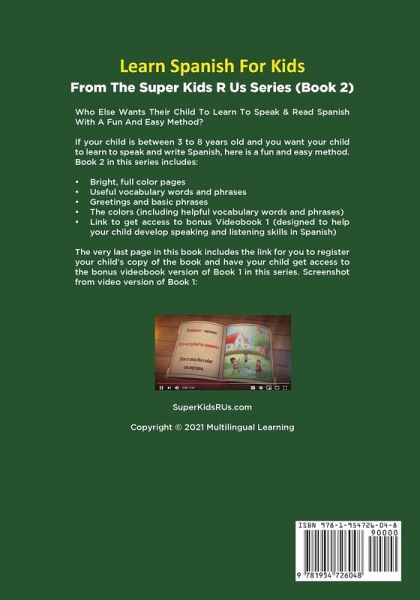 Who Else Wants Their Child To Learn To Speak and Read Spanish With A Fun And Easy Method? If your child is between 3 to 8 years old and you want your child to become bi-lingual, here's a fun and easy method. With this method, your child will learn to speak and read Spanish. Book 2 in this series includes: - Bright, full color pages - Useful vocabulary words and phrases - Greetings and basic phrases - The colors (including helpful vocabulary words and phrases) - Link to get access to bonus Videobook 1 (designed to help your child develop speaking and listening skills in Spanish)