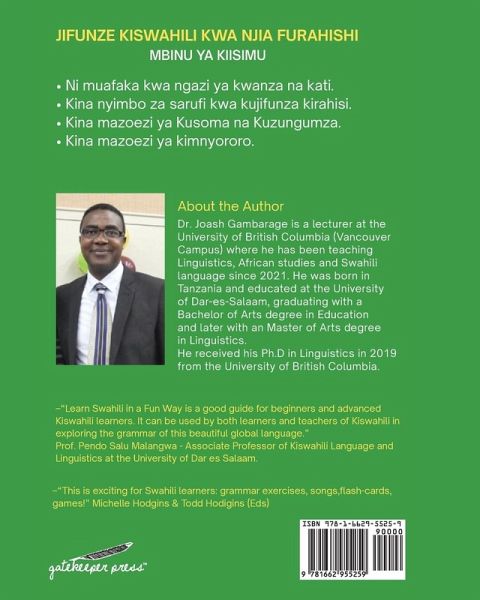 Over years of teaching Swahili to adults and children, Dr. Joash Gambarage has learned that repetitions (or exercises) are fundamental to helping learners grasp grammar and speak and read fluently quickly. Learn Swahili in a Fun Way: A Linguistic Approach offers an approach grounded in the beaty of language, and it is built on a wide variety of exercises and strategies for both beginning and intermediate learners. In each chapter, Dr. Gambarage offers pronunciation exercises, real-world conversation exercises, engaging stories, selected readings, games, and more. Readers will be able to access audio files for grammar songs, speaking/listening dialogues, and reading exercises via the book's accompanying website at https://sites.google.com/view/learnswahiliinafunway/home. Additional instruction includes tips on teaching and learning African languages, Bantu grammar/syntax, and language documentation. Accompanying content is available on YouTube in video, audio, and karaoke formats. Dr. Gambarage's engaging and fun learning tools include: A game adapted to help the student learn possessive pronouns A cartoon character who helps with learning numbers An engaging story that teaches the perfect and past tenses with ease Grammar songs for learning pronouns, tenses, and noun classes The LalaLAla strategy for mastering stress Color illustrations and iterative grammar excises for critical thinking Based on the curriculum of Dr. Gambarage's own lecture notes, songs, and games, learners will find his instruction in Learn Swahili in a Fun Way invaluable as they enjoy their progress in the mastery of Swahili.