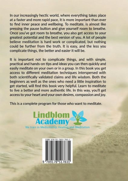 In our increasingly hectic world, where everything takes place at a faster and more rapid pace, it is more important than ever to find inner peace and wellbeing. To meditate, is almost like pressing the pause button and give yourself room to breathe. Once you've got room to breathe, you also get access to your greatest potential and the best version of you.A lot of people believe meditation is hard work or complicated, but nothing could be further from the truth. It is easy, and the less you complicate things, the better and easier it will be. It is important not to complicate things, and with simple, practical and hands-on tips and ideas you can then quickly and easily meditate on your own or in a group.In this book you get access to different meditation techniques interspersed with both scientifically validated claims and life wisdom. Both the beginners as well as the ones who need a little inspiration to get started, will find this book very helpful. Learn to meditate to live a better and more authentic life. In this way, you'll get access to your heart and your own desires, compassion and joy.This is a complete program for those who want to meditate.