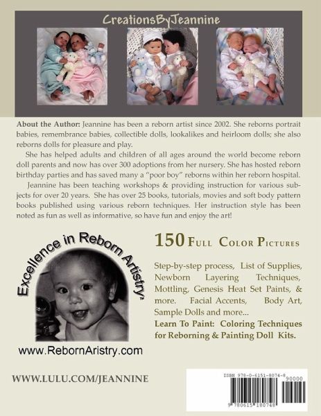 PART 2: Realistic Newborn Layering Techniques Can you imagine a baby so perfect, it looks just like it was newborn? If you need light, medium and darker skin tones with a hint of the blotchy effect and a touch of mottling, then this is the book for you. This art book provides the following valuable information for the beginning artist or reborn hobbyist: Create your base skin tone from the outside with external application techniques; See the Newborn and Just born painting techniques shown on three of the Secrist doll kits: Zoe, Ming & Starling; A wonderful technique for newborn baby in your life. Also touches on Veining, Facial Accents including tears and Body Art options; sure to create a heirloom and/or collectible infant doll. Bring to life, your own Custom Reborn; So realistic, your friends will think it is a real newborn baby. 150 Full Color Pictures for your learning enjoyment.