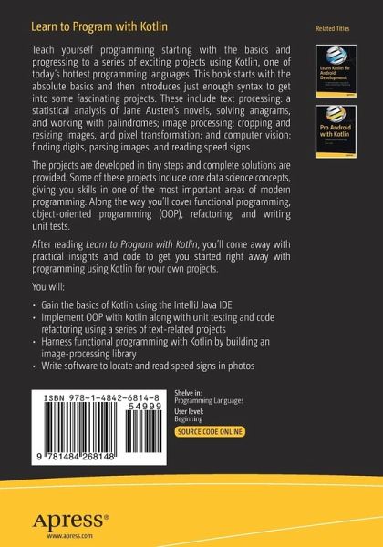 Teach yourself programming starting with the basics and progressing to a series of exciting projects using Kotlin, one of today's hottest programming languages. This book starts with the absolute basics and then introduces just enough syntax to get into some fascinating projects. These include text processing: a statistical analysis of Jane Austen's novels, solving anagrams, and working with palindromes; image processing: cropping and resizing images, and pixel transformation; and computer vision: finding digits, parsing images, and reading speed signs.