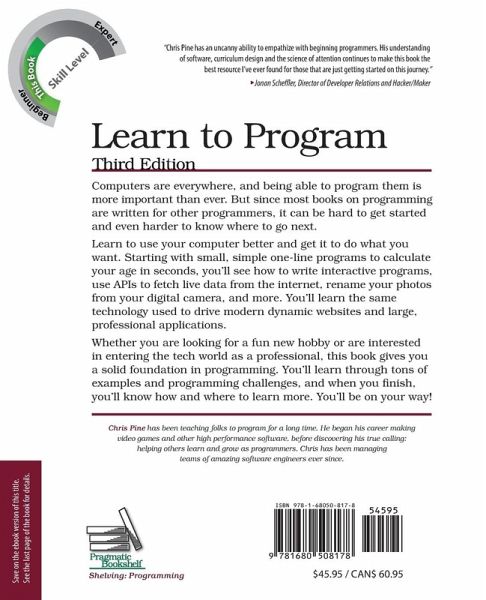 It's easier to learn how to program a computer than it has ever been before. Now everyone can learn to write programs for themselves - no previous experience is necessary. Chris Pine takes a thorough, but lighthearted approach that teaches you the fundamentals of computer programming, with a minimum of fuss or bother. Whether you are interested in a new hobby or a new career, this book is your doorway into the world of programming. Computers are everywhere, and being able to program them is more important than it has ever been. But since most books on programming are written for other programmers, it can be hard to break in. At least it used to be. Chris Pine will teach you how to program. You'll learn to use your computer better, to get it to do what you want it to do. Starting with small, simple one-line programs to calculate your age in seconds, you'll see how to write interactive programs, to use APIs to fetch live data from the internet, to rename your photos from your digital camera, and more. You'll learn the same technology used to drive modern dynamic websites and large, professional applications. Whether you are looking for a fun new hobby or are interested in entering the tech world as a professional, this book gives you a solid foundation in programming. Chris teaches the basics, but also shows you how to think like a programmer. You'll learn through tons of examples, and through programming challenges throughout the book. When you finish, you'll know how and where to learn more - you'll be on your way. What You Need: All you need to learn how to program is a computer (Windows, macOS, or Linux) and an internet connection. Chris Pine will lead you through setting set up with the software you will need to start writing programs of your own.