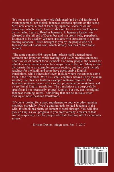 The design of this Japanese Reader is based on our belief that the most enjoyable and efficient way to learn to read in Japanese is to dive in and start reading sentences almost immediately, learning new kanji as you go. In order to make this approach workable, we introduce about ten new kanji at the beginning of each chapter and then ask you to take a quick pre-test on their pronunciations before starting to read. We include in each chapter only kanji characters that you know or are in the process of learning, and we provide immediate feedback about your reading accuracy in the form of same-page romaji equivalents and translations. Although it might seem impractical to start reading practice before you have learned Japanese characters very well, this approach is firmly grounded in a study technique known as Active Recall, which can be defined as "learning by answering questions." Active Recall is the basis of flashcard learning generally, and it is highly effective for building strong memories, compared to more passive study methods. When you try to read one of the Japanese sentences in this book, you are essentially asking yourself two questions: "How is this sentence pronounced, and what does it mean?" This self-interrogation forces your brain to work in order to recognize the characters in the sentence and recall their pronunciations. When you need to look at the answers to the implied questions, they are available on the same page. This means that you can significantly reduce the amount of time that you spend memorizing kanji. You can also minimize the number of times that you need to look up information in other books or dictionaries as you read. The book includes 4,200 Japanese sentences which employ only hiragana, katakana and 608 "target" kanji. Romaji equivalents and translations are always available, printed in very small text in a column adjacent to the Japanese text, but they are easy to ignore when you don’t need them. By simply reading and taking advantage of the feedback and the references in the book, you will soon be able to read with confidence. The target kanji that are used in the sentences are taught by means of an innovative "Kanji Catalogue." This Catalogue includes pronunciations, meanings, descriptions of the kanji as images, and examples of words that use the kanji. When you encounter a kanji in the Japanese text that you do not know well, you can easily look it up with the help of the Pronunciation Index which contains 1,634 kanji pronunciations linked to kanji reference numbers in the Kanji Catalogue. After you locate a particular kanji in the Catalogue, we suggest that you focus on the memory aides provided. These memory aides are both visual (descriptions of kanji as images) and verbal (homophones for each of the kanji's pronunciations). If you want to progress further with your Japanese reading, please be aware that Learn to Read in Japanese, Volume II is now available for purchase. This second book introduces 600 additional kanji, for a total of 1208 in the two books. Please visit us at JapaneseAudioLessons.com, where we also provide 30 hours of free high-quality Japanese audio lessons.