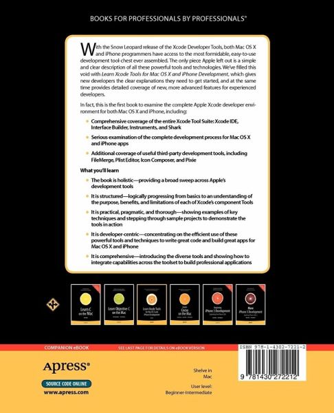 Introducing Xcode Tools for Mac OS X and the iPhone.- Introducing Xcode Tools for Mac OS X and the iPhone.- The Core Xcode Toolset.- Introducing the Xcode Workspace.- Interface Builder.- Core iPhone Tools.- Frameworks in Xcode.- Model-View-Controller in Xcode.- Debugging Your Xcode Projects.- Xcode Documentation.- Developing an Application.- Enhancing Development with Companion Tools.- Source-Code Management with Subversion.- Unit testing in Xcode.- Monitoring, Analysis, and Performance Tools.- Supporting Tools.- Support Tools for the Busy Developer.- Usability and Accessibility.- Packaging and Distribution.