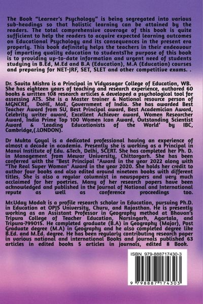 The book "Learner's Psychology" has been written with a specific The purpose of this book is to providing up-to-date information and urgent need of students studying in B.Ed, M.Ed and B.A (Education), M.A (Education) courses and preparing for NET-JRF, SET, SLET and other competitive exams. We are confident that this book fulfills all essential requirements and its wide circulation will definitely exert an important influence on the theory of Education. In completing this self-imposed stupendous task, the authors have been quite conscious of their numerous limitations in view of the multifarious subject-matter to be collected for completing this volume. Educational Psychology has been taught as a major subject in Teacher Education Programmes at different levels on the implicit assumption that knowledge of Educational Psychology gives insight into the problems of teaching learning and develops other necessary professional skills and competencies in the progressive teachers to face the classroom teaching give the teacher much of what he needs to achieve his goals by enabling him to understand, control and predict the behaviour of students. Psychologist and general readers may also get valuable information regarding the theories and practices of the Psychology of Education all over world.