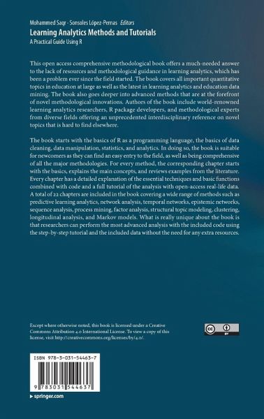 This open access comprehensive methodological book offers a much-needed answer to the lack of resources and methodological guidance in learning analytics, which has been a problem ever since the field started. The book covers all important quantitative topics in education at large as well as the latest in learning analytics and education data mining. The book also goes deeper into advanced methods that are at the forefront of novel methodological innovations. Authors of the book include world-renowned learning analytics researchers, R package developers, and methodological experts from diverse fields offering an unprecedented interdisciplinary reference on novel topics that is hard to find elsewhere. The book starts with the basics of R as a programming language, the basics of data cleaning, data manipulation, statistics, and analytics. In doing so, the book is suitable for newcomers as they can find an easy entry to the field, as well as being comprehensive of all the major methodologies. For every method, the corresponding chapter starts with the basics, explains the main concepts, and reviews examples from the literature. Every chapter has a detailed explanation of the essential techniques and basic functions combined with code and a full tutorial of the analysis with open-access real-life data. A total of 22 chapters are included in the book covering a wide range of methods such as predictive learning analytics, network analysis, temporal networks, epistemic networks, sequence analysis, process mining, factor analysis, structural topic modeling, clustering, longitudinal analysis, and Markov models. What is really unique about the book is that researchers can perform the most advanced analysis with the included code using the step-by-step tutorial and the included data without the need for any extra resources.