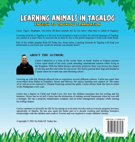 Learning Animals In Tagalog (English to Tagalog translation) Lions. Tigers. Elephants. You know all these animals but do you know what they're called in Tagalog? Learning Animals in Tagalog is a fun new book designed to help you learn the ancient language of Tagalog, one animal at a time! Easy to read and fun to look at, this is the perfect beginner's book your child needs. Part of the wildly popular Kids of Today Inc. book series, Learning Animals In Tagalog will keep you entertained as you learn new words for animals you already know! "We enrich the lives of our children around the globe by spreading love and positivity through perceptions of culture" - Kids of Today Inc.