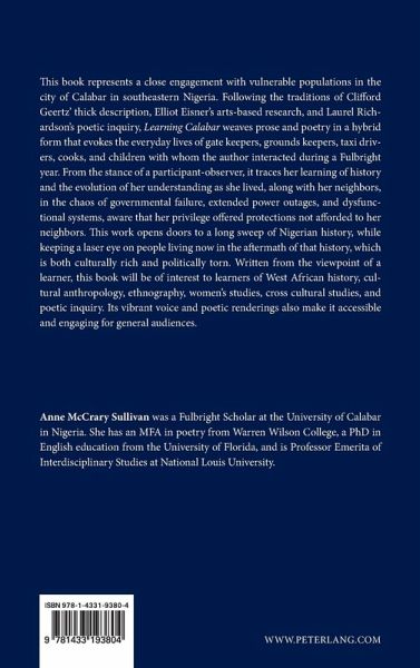 This book represents a close engagement with vulnerable populations in the city of Calabar in southeastern Nigeria. Following the traditions of Clifford Geertz' thick description, Elliot Eisner's arts-based research, and Laurel Richardson's poetic inquiry, Learning Calabar weaves prose and poetry in a hybrid form that evokes the everyday lives of gate keepers, grounds keepers, taxi drivers, cooks, and children with whom the author interacted during a Fulbright year. From the stance of a participant-observer, it traces her learning of history and the evolution of her understanding as she lived, along with her neighbors, in the chaos of governmental failure, extended power outages, and dysfunctional systems, aware that her privilege offered protections not afforded to her neighbors. This work opens doors to a long sweep of Nigerian history, while keeping a laser eye on people living now in the aftermath of that history, which is both culturally rich and politically torn. Written from the viewpoint of a learner, this book will be of interest to learners of West African history, cultural anthropology, ethnography, women's studies, cross cultural studies, and poetic inquiry. Its vibrant voice and poetic renderings also make it accessible and engaging for general audiences.