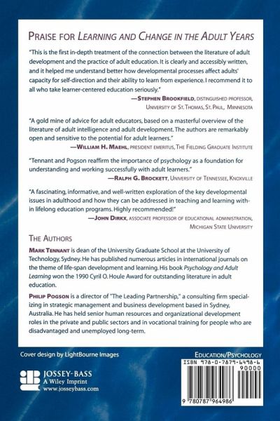 "This is the first in-depth treatment of the connection between the literature of adult development and the practice of adult education. It is clearly and accessibly written, and it helped me understand better how developmental processes affect adults' capacity for self-direction and their ability to learn from experience. I recommend it to all who take learner-centered education seriously." --Stephen Brookfield, distinguished professor, University of St. Thomas, St. Paul, Minnesota "A gold mine of advice for adult educators, based on a masterful overview of the literature of adult intelligence and adult development. The authors are remarkably open and sensitive to the potential for adult learners." --William H. Maehl, president emeritus, The Fielding Graduate Institute "Tennant and Pogson reaffirm the importance of psychology as a foundation for understanding and working successfully with adult learners." --Ralph G. Brockett, University of Tennessee, Knoxville "A fascinating, informative, and well-written exploration of the key developmental issues in adulthood and how they can be addressed in teaching and learning within lifelong education programs. Highly recommended!" --John Dirkx, associate professor of educational administration, Michigan State University