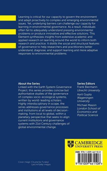 Learning helps to govern the environment and adapt proactively to complex and emerging environmental issues. This Element synthesizes insights from academic and applied research on learning to inform both research and practice. It helps better understand, diagnose, and support learning and more adaptive responses to environmental problems.