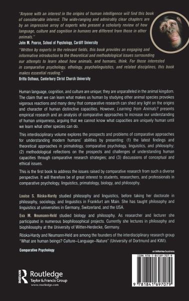 Human language, cognition, and culture are unique; they are unparalleled in the animal kingdom. The claim that we can learn what makes us human by studying other animal species provokes vigorous reactions and many deny that comparative research can shed any light on the origins and character of human distinctive capacities. However, Learning from Animals? presents empirical research and an analysis of comparative approaches for an understanding of human uniqueness, arguing that we cannot know what capacities are uniquely human until we learn what other species can do. This interdisciplinary volume explores the prospects and problems of comparative approaches for understanding modern humans' abilities by presenting: (1) the latest findings and theoretical approaches in primatology, comparative psychology, linguistics, and philosophy; (2) methodological reflections on the prospects and challenges of understanding human capacities through comparative research strategies; and (3) discussions of conceptual and ethical issues. This is the first book to address the issues raised by comparative research from such a diverse perspective. It will therefore be of great interest to students, researchers, and professionals in comparative psychology, linguistics, primatology, biology, and philosophy.