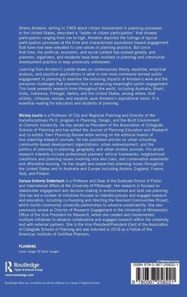 Sherry Arnstein, writing in 1969 about citizen involvement in planning processes in the United States, described a "ladder of citizen participation" that showed participation ranging from low to high. Arnstein depicted the failings of typical participation processes at the time and characterized aspirations toward engagement that have now been elevated to core values in planning practice. But since that time, the political, economic, and social context has evolved greatly, and planners, organizers, and residents have been involved in planning and community development practice in ways previously unforeseen. Learning from Arnstein's Ladder draws on contemporary theory, expertise, empirical analysis, and practical applications in what is now more commonly termed public engagement in planning to examine the enduring impacts of Arnstein's work and the pervasive challenges that planners face in advancing meaningful public engagement. This book presents research from throughout the world, including Australia, Brazil, India, Indonesia, Portugal, Serbia, and the United States, among others, that utilizes, critiques, revises, and expands upon Arnstein's aspirational vision. It is essential reading for educators and students of planning.