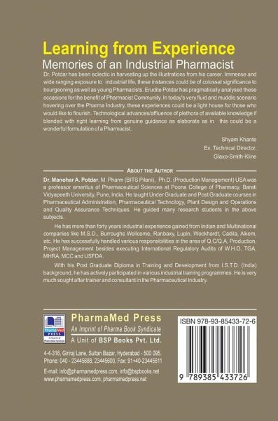 Dr. Potdar has been eclectic in harvesting up the illustrations from his career. Immense and wide ranging exposure to industrial life, these instances could be of colossal significance to bourgeoning as well as young Pharmacists. Erudite Potdar has pragmatically analysed these occasions for the benefit of Pharmacist Community. In today's very fluid and muddle scenario hovering over the Pharma Industry, these experiences could be a light house for those who would like to flourish. Technological advances/affluence of plethora of available knowledge if blended with right learning from genuine guidance as elaborate as in this could be a wonderful formulation of a Pharmacist.