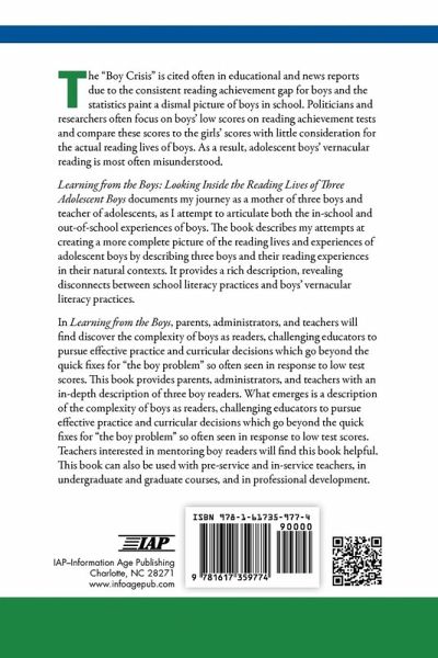 The "Boy Crisis" is cited often in educational and news reports due to the consistent reading achievement gap for boys and the statistics paint a dismal picture of boys in school. Politicians and researchers often focus on boys' low scores on reading achievement tests and compare these scores to the girls' scores with little consideration for the actual reading lives of boys. As a result, adolescent boys' vernacular reading is most often misunderstood. This book documents my journey as a mother of three boys and teacher of adolescents, as I attempt to articulate both the in-school and out-of-school experiences of boys. The book describes my attempts at creating a more complete picture of the reading lives and experiences of adolescent boys by describing three boys and their reading experiences in their natural contexts. It provides a rich description, revealing disconnects between school literacy practices and boys' vernacular literacy practices. In this book, parents, administrators, and teachers will find discover the complexity of boys as readers, challenging educators to pursue effective practice and curricular decisions which go beyond the quick fixes for "the boy problem" so often seen in response to low test scores. This book provides parents, administrators, and teachers with an in-depth description of three boy readers. What emerges is a description of the complexity of boys as readers, challenging educators to pursue effective practice and curricular decisions which go beyond the quick fixes for "the boy problem" so often seen in response to low test scores. Teachers interested in mentoring boy readers will find this book helpful. This book can also be used with pre-service and in-service teachers, in undergraduate and graduate courses, and in professional development.