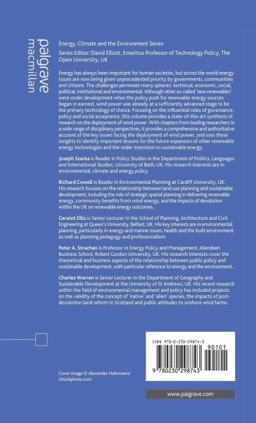 Wind Power: Towards a Sustainable Energy Future?; C.Warren , R.Cowell , G.Ellis , P.A.Strachan & J.Szarka PART I: GOVERNANCE AND POLICY LEARNING Wind Power: Opportunities, Limits and Challenges; D.Elliott Wind Power Policy in Germany and the UK; V.Lauber Wind Power and Spatial Planning in the UK; S.Power & R.Cowell From Laggard to World Leader: the United Kingdom's Adoption of MarineWind Energy; S.Jay Planning with the Missing Masses: Innovative Wind Power Planning in France; A.Nadai PART II: SOCIETAL ENGAGEMENT WITH WIND POWER The Misdirected Opposition to Wind Energy; M.J.Pasqualletti The Social Experience of Noise from Wind Farms; C.Haggett Navigating a Minefield? Wind Power and Local Community BenefitFunds; P.A.Strachan & D.Jones Fostering Public Engagement in Wind Energy Development: the Role of Intermediaries and Community Benefits; P.Devine-Wright Social Acceptance of Wind Energy Projects: Learning from Trans-national Experience; S.Huber , R.Hobarty & G.Ellis Drawing Lessons from Wind Power for Future Sustainable Energy; J.Szarka , G.Ellis , R.Cowell , P.A.Strachan & C.Warren