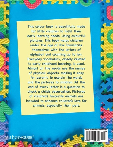 This colour book is beautifully made for little children to fulfil their early learning needs. Using colourful pictures, this book helps children under the age of five familiarise themselves with the letters of alphabet and counting up to ten. Everyday vocabulary, closely related to early childhood learning, is used. Almost all the words are the names of physical objects, making it easy for parents to explain the words and the pictures to children. At the end of every letter is a question to check a child's observation. Pictures of children's favourite animals are included to enhance children's love for animals, especially their pets.