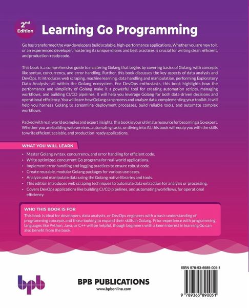 DESCRIPTION Go has transformed the way developers build scalable, high-performance applications. Whether you are new to it or an experienced developer, mastering its unique idioms and best practices is crucial for writing clean, efficient, and production-ready code. This book is a comprehensive guide to mastering Golang that begins by covering basics of Golang, with concepts like syntax, concurrency, and error handling. Further, this book discusses the key aspects of data analysis and DevOps. It introduces web scraping, machine learning, data handling and manipulation, performing Exploratory Data Analysis-all within the Golang ecosystem. For DevOps enthusiasts, this book highlights how the performance and simplicity of Golang make it a powerful tool for creating automation scripts, managing workflows, and building CI/CD pipelines. It will help you leverage Golang for both data-driven decisions and operational efficiency. You will learn how Golang can process and analyze data, complementing your toolkit. It will help you harness Golang to streamline deployment processes, build reliable tools, and automate complex workflows. Packed with real-world examples and expert insights, this book is your ultimate resource for becoming a Go expert. Whether you are building web services, automating tasks, or diving into AI, this book will equip you with the skills to write efficient, scalable, and production-ready applications. WHAT YOU WILL LEARN ¿ Master Golang syntax, concurrency, and error handling for efficient code. ¿ Write optimized, concurrent Go programs for real-world applications. ¿ Implement error handling and logging practices to ensure robust code. ¿ Create reusable, modular Golang packages for various use cases. ¿ Analyze and manipulate data using the Golang native libraries and tools. WHO THIS BOOK IS FOR This book is ideal for developers, data analysts, or DevOps engineers with a basic understanding of programming concepts and those looking to expand their skills in Golang. Prior experience with programming languages like Python, Java, or C++ will be helpful, though beginners with a keen interest in learning Go can also benefit from the book.