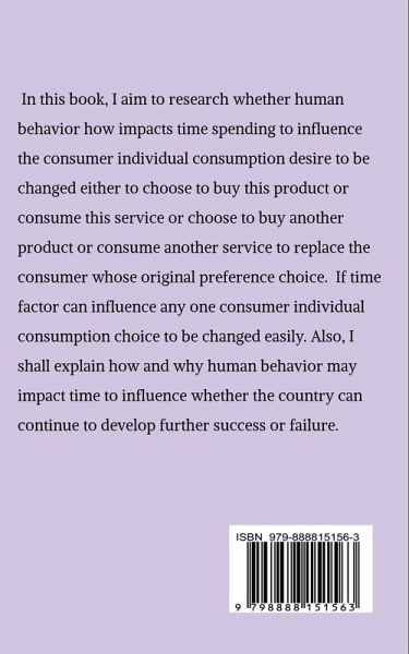 How social change influences human behavioral change ? Why human behavior may be influenced by social change? Our individual behavior whether can be influenced to bring negative or positive attitude by social change? I shall attempt to indicate cases to explain whether our individual behavior can be influenced to changed by social environment change. Readers can have more understand how and why social change may influence our behavior in possible. Behavioral economy is one useful and fun social subject. Behavioral economists ususally research how and why human behaviors may influence economy growth or recession, or how and why economy environment changing factor may influence human behavior changes. In this book, I aim to research whether human behavior how impacts time spending to influence the consumer individual consumption desire to be changed either to choose to buy this product or consume this service or choose to buy another product or consume another service to replace the consumer whose original preference choice. If time factor can influence any one consumer individual consumption choice to be changed easily. Also, I shall explain how and why human behavior may impact time to influence whether the country can continue to develop further success or failure.