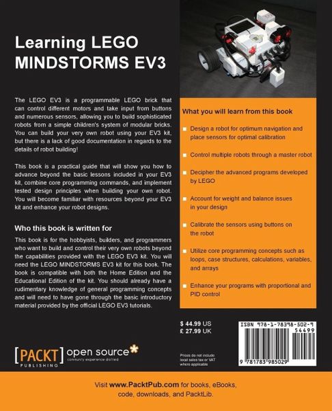 Build and create interactive, sensor-based robots using your LEGO MINDSTORMS EV3 kit Key Features Optimize the use of multiple sensors to build a robot that navigates and interacts with its environment Work with both the Home Edition and the Educational Edition of the LEGO EV3 Mindstorms kit A practical guide with step-by-step building instructions to help you create your very own robot Book Description The LEGO EV3 is a programmable LEGO brick that can control different motors and take input from buttons and numerous sensors, allowing you to build sophisticated robots from a simple children's system of modular bricks. You can build your very own robot using your EV3 kit, but there is a lack of good documentation in regards to the details of robot building! This book is a practical guide that will show you how to advance beyond the basic lessons included in your EV3 kit, combine core programming commands, and implement tested design principles when building your own robot. You will become familiar with resources beyond your EV3 kit and enhance your robot designs. What you will learn Design a robot for optimum navigation and place sensors for optimal calibration Control multiple robots through a master robot Decipher the advanced programs developed by LEGO Account for weight and balance issues in your design Calibrate the sensors using buttons on the robot Utilize core programming concepts such as loops, case structures, calculations, variables, and arrays Enhance your programs with proportional and PID control