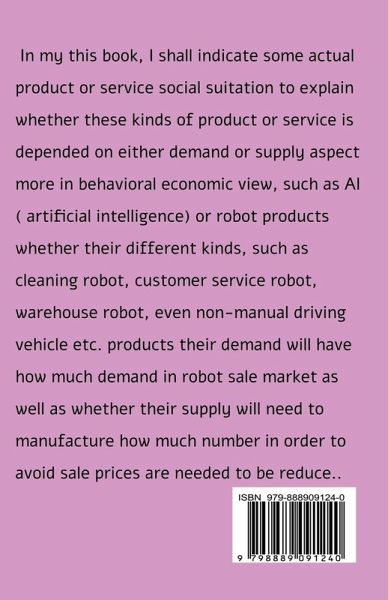 Introduction In our societies , any kinds of products or services must need to apply demand and supply economic theory to analyze whether the kind of product or service may be value to invent to sell or serve to their customers in consumer market, if the kind of product or service demand number is less, then it ought not to raise manufacturing number to avoid "low price " sale or if the kind of product demand number is more, then it ought raise manufacturing number to have enough number in order to raise " high price" sale to satisfy customers their needs to buy their products.However, whether your product or serive's demand number depends on supply number or your product or service's supply number depends on demand number in order to make ths sale price is reasonable high or low level and reasonable supply number valuation. In my this book, I shall indicate some actual product or service social suitation to explain whether these kinds of product or service is depended on either demand or supply aspect more in behavioral economic view, such as AI ( artificial intelligence) or robot products whether their different kinds, such as cleaning robot, customer service robot, warehouse robot, even non-manual driving vehicle etc. products their demand will have how much demand in robot sale market as well as whether their supply will need to manufacture how much number in order to avoid sale prices are needed to be reduce.