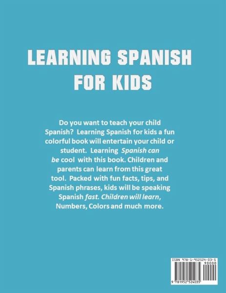 Do you want to teach your child Spanish? Learning Spanish for kids a fun colorful book will entertain your child or student. Learning Spanish can be cool with this book. Children and parents can learn from this great tool. Packed with fun facts, tips, and Spanish phrases, kids will be speaking Spanish fast. Children will learn: Numbers Colors and much more As an bonus, the book includes a comprehensive note section to follow the progress of your child/student with this book.