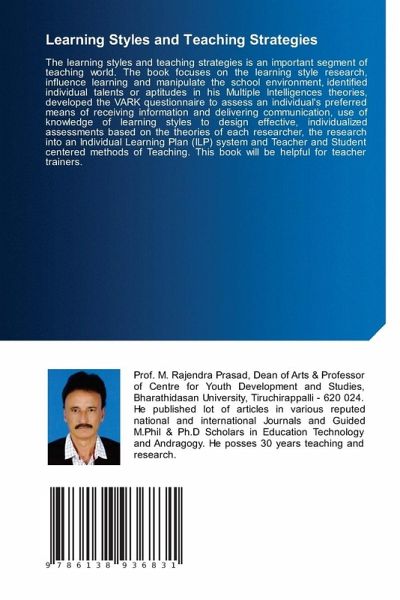 The learning styles and teaching strategies is an important segment of teaching world. The book focuses on the learning style research, influence learning and manipulate the school environment, identified individual talents or aptitudes in his Multiple Intelligences theories, developed the VARK questionnaire to assess an individual's preferred means of receiving information and delivering communication, use of knowledge of learning styles to design effective, individualized assessments based on the theories of each researcher, the research into an Individual Learning Plan (ILP) system and Teacher and Student centered methods of Teaching. This book will be helpful for teacher trainers.