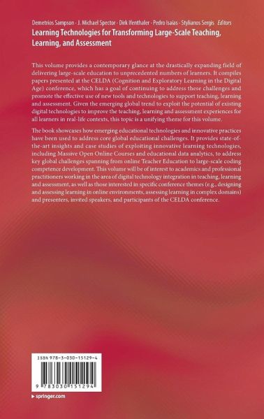 Part I: Teaching, Learning and Assessment at large-scale: Trends and Challenges.- Open Educational Resources: Educational Technology As A Driver For Educational Reform.- Emerging Trends in Online Teacher Education.- Professional Identity Development in Online Environments.- Divulging Personal Information Within Learning Analytics Systems.- Challenges Of Big Data In Educational Assessment.- Innovative Collaborative Learning Strategies For Integrated Interactive E-Learning In The 21st Century.- Part II: Analytics for Improving Learning Experiences.- Learning Analytics To Understand Cultural Impacts On Technology Enhanced Learning.- What Do Learners' Online Interaction Data Imply?.- Comparing Learner Community Behavior In Multiple Presentations Of A Massive Open Online Course.- Hadjerrouit, S. Evaluating The Interactive Learning Tool Simreal+ For Visualizing And Simulating Mathematical Concepts.- Participation And Achievement In Enterprise MOOCs For Professional Learning.- Online Learners' Navigational Patterns Based On Data Mining In Terms Of Learning Achievement.- Part III: Analytics for Personalizing Teaching and Assessment.- Supporting Development of Students' Coding Competences with Teaching and Learning Analytics.- Purposeful Exploratory Learning with Video Using Analysis Categories.- Widening And Deepening Questions In Web-Based Investigative Learning.- The Impact Of Middle-School Students' Feedback Choices And Performance On Their Feedback Memory.- Cache-Cache Comparison For Supporting Meaningful Learning.- E-Learning In Chemistry Education: Self-Regulated Learning In A Virtual Classroom.- Concluding Remarks.- Learning Technologies for Transforming Large-Scale Teaching, Learning and Assessment - A Synthesis and a Look Forward.