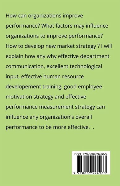 How can organizations improve performance? What factors may influence organizations to improve performance? How to develop new market strategy ? I will explain how any why effective department communication, excellent technological input, effective human resource developement training, good employee motivation strategy and effective performance measurement strategy can influence any organization's overall performance to be more effective. I shall indicate the reasons to explain why above any one of these factors have indirect relationship to influence the organization's overall performance effectiveness. Readers can earn fresh opinions to acknowledge that these any one factors can be possible to influence organization's overall performance effectiveness.