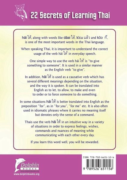 Learning Thai with hâi ¿¿¿ The Audio files can be downloaded free from the following website: www.thaibooks.net hâi ¿¿¿, along with words like dâai ¿¿,¿ l¿¿¿u ¿¿¿¿ and k¿¿¿ ¿¿, is one of the most important words in the Thai language. When speaking Thai, it is important to understand the correct usage of the verb hâi ¿¿¿ in everyday speech. One simple way to use the verb hâi ¿¿¿ is "to give something to someone". It is used in a similar manner as the English verb "to give". In addition, hâi ¿¿¿ is used as a causative verb which has several different meanings depending on the situation, and the way it is spoken. It can be translated into English as to let, to allow, to make and even to order or to force someone to do something. In some situations hâi ¿¿¿ is better translated into English as the preposition "for", "for you", "for me" etc. It is also often used in idiomatic phrases where it carries no meaning itself but denotes only the sense of a command. Thais use the verb hâi ¿¿¿ in an intuitive way in a variety of situations in order to express feelings, wishes, commands and nuances of meaning while communicating with each other every day. If you learn this word well, you will be rewarded.
