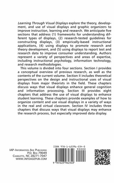 The purpose of the volume is to explore the theory, development and use of visual displays and graphic organizers to improve instruction, learning and research. We anticipate five sections that address (1) frameworks for understanding different types of displays, (2) research-tested guidelines for constructing displays, (3) empirically-based instructional applications, (4) using displays to promote research and theory development, and (5) using displays to report test and research data to improve consumer understanding. Authors represent a variety of perspectives and areas of expertise, including instructional psychology, information technology, and research methodologies. The volume is divided into four sections. Section 1 provides a conceptual overview of previous research, as well as the contents of the current volume. Section 2 includes theoretical perspectives on the design and instructional uses of visual displays from major theorists in the field. These chapters discuss ways that visual displays enhance general cognition and information processing. Section 3 provides eight chapters that address the use of visual displays to enhance student learning. These chapters provide examples of how to organize content and use visual displays in a variety of ways in the real and virtual classroom. Section 4 includes three chapters that discuss ways that visual displays may enhance the research process, but especially improved data display.