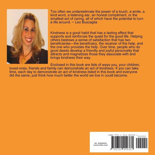 Kindness is a good habit that has a lasting effect that supports and reinforces the quest for the good life. Helping others bestows a sense of satisfaction that has two beneficiaries-the beneficiary, the receiver of the help, and the one who provides the help. Over time, people who do good deeds develop a friendly and joyful personality that attracts and magnetizes those they associate with and brings kindness their way. Enclosed in this book are lists of ways you, your children, loved-ones, friends and family can demonstrate an act of kindness. If you can take time, each day to demonstrate an act of kindness listed in this book and everyone did the same, just think how much better the world we live in could become.
