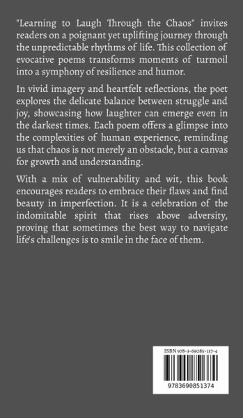 "Learning to Laugh Through the Chaos" invites readers on a poignant yet uplifting journey through the unpredictable rhythms of life. This collection of evocative poems transforms moments of turmoil into a symphony of resilience and humor. In vivid imagery and heartfelt reflections, the poet explores the delicate balance between struggle and joy, showcasing how laughter can emerge even in the darkest times. Each poem offers a glimpse into the complexities of human experience, reminding us that chaos is not merely an obstacle, but a canvas for growth and understanding. With a mix of vulnerability and wit, this book encourages readers to embrace their flaws and find beauty in imperfection. It is a celebration of the indomitable spirit that rises above adversity, proving that sometimes the best way to navigate life's challenges is to smile in the face of them.