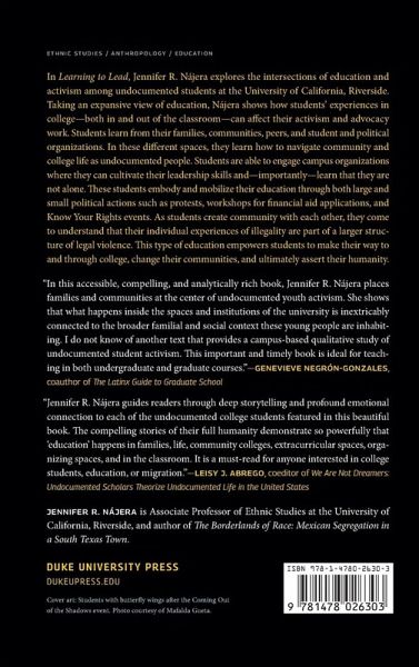 In Learning to Lead, Jennifer R. Nájera explores the intersections of education and activism among undocumented students at the University of California, Riverside. Taking an expansive view of education, Nájera shows how students' experiences in college-both in and out of the classroom-can affect their activism and advocacy work. Students learn from their families, communities, peers, and student and political organizations. In these different spaces, they learn how to navigate community and college life as undocumented people. Students are able to engage campus organizations where they can cultivate their leadership skills and-importantly-learn that they are not alone. These students embody and mobilize their education through both large and small political actions such as protests, workshops for financial aid applications, and Know Your Rights events. As students create community with each other, they come to understand that their individual experiences of illegality are part of a larger structure of legal violence. This type of education empowers students to make their way to and through college, change their communities, and ultimately assert their humanity.