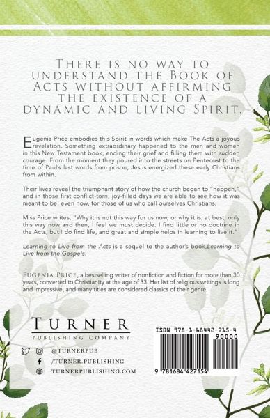 There is no way to understand the Book of Acts without affirming the existence of a dynamic and living Spirit. Eugenia Price embodies this Spirit in words which make The Acts a joyous revelation. Something extraordinary happened to the men and women in this New Testament book, ending their grief and filling them with sudden courage. From the moment they poured into the streets on Pentecost to the time of Paul's last words from prison, Jesus energized these early Christians from within. Their lives reveal the triumphant story of how the church began to "happen," and in those first conflict-torn, joy-filled days we are able to see how it was meant to be, even now, for those of us who call ourselves Christians. Miss Price writes, “Why it is not this way for us now, or why it is, at best, only this way now and then, I feel we must decide. I find little or no doctrine in the Acts, but I do find life, and great and simple helps in learning to live it.” Learning to Live from the Acts is a sequel to the author’s book, Learning to Live From the Gospels.