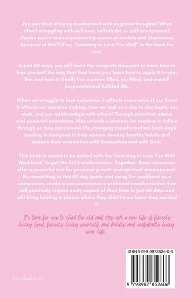 "Learning to Love You Well" is a life-changing 60-day guide to help women transform their lives and discover the transformative power of God's love and how it impacts self-love. In a world where we're constantly bombarded with messages about how we should look, act, and be, it's easy to forget the most important relationship we have - the one with ourselves and with God. The truth is, when we're struggling to love ourselves, our decisions, actions, and everything we do are impacted by that. That's why this book is designed to help women learn how to love themselves the way that God loves them, and in doing so, transform every aspect of their lives! Through powerful anecdotes and practical advice, "Learning to Love You Well" takes readers on a journey of self-discovery and personal growth. Over the course of 60 days, readers will explore every area that's crucial to understand, as well as crucial to walk through, to learn to love themselves well. Each day's reading is designed to help women develop healthy habits and deepen their connection with themselves and with God. This book is meant to be paired with the "Learning to Love You Well Workbook" to get the full transformation. Together, these resources offer a powerful tool for personal growth and spiritual development, helping you to heal, unlock your full potential, and live a life filled with joy, peace, and purpose. By committing to this 60-day guide and using the workbook as a companion, readers can experience a profound transformation that will positively impact every aspect of their lives in just 60 days. This book is a must-read for any woman who struggles with self-love, self-doubt, or simply wants to enhance her overall well-being. By learning to love yourself well, you can transform everything about you as a whole - your relationships, your career, and your overall sense of purpose and fulfillment. This book is not just a guide, it's a powerful tool for personal growth and spiritual development that will help women unlock their full potential and live their best lives. If you're ready to transform your life, walk in confidence and freedom, and finally love the person that God has created you to be, then "Learning to Love You Well" is the book for you. Start your journey towards healing and transformation today! It's time for you to shed the old and step into a new life of fiercely loving God, fiercely loving yourself, and boldly and confidently living your life.